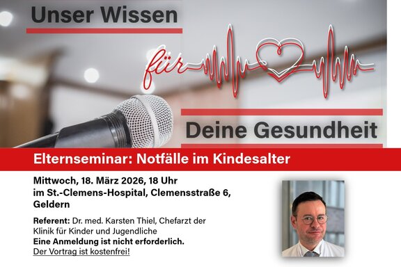St.-Clemens-Hospital Geldern16.03.2026St.-Clemens-Hospital GeldernElternseminar „Notfälle im Kindesalter“ am Mittwoch, 18. März 2026, um 18 Uhr im St.-Clemens-Hospital GeldernWas tun, wenn sich ein Kind verbrennt, einen Stromunfall erleidet oder wiederbelebt werden muss? Im…