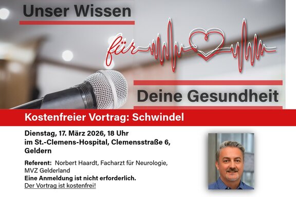 St.-Clemens-Hospital Geldern16.03.2026St.-Clemens-Hospital GeldernKostenfreier Vortrag zum Thema „Schwindel“ am Dienstag, 17. März 2026 im St.-Clemens-Hospital GeldernSchwindel kann viele Ursachen haben – von harmlos bis ernsthaft. In einem kostenfreien Vortrag im…