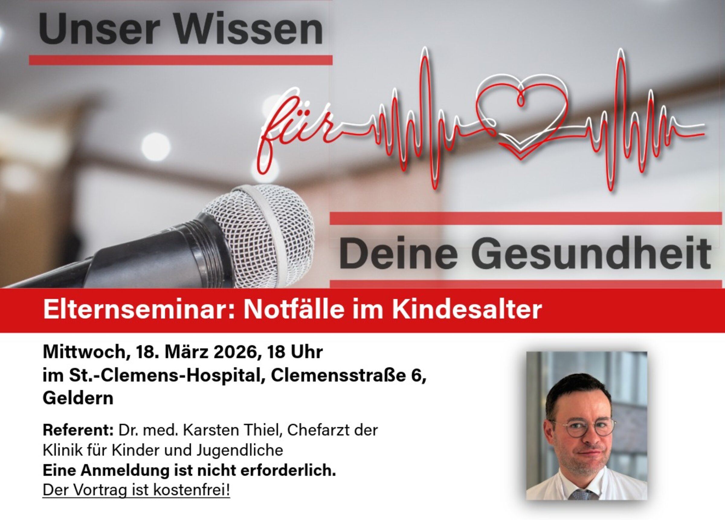 Wie verhalte ich mich, wenn sich mein Kind verbrennt? Was tue ich bei einem Elektrounfall? Welche Maßnahmen sollte ich bei Insektenstichen ergreifen? Wie verhalte ich mich, wenn mein Kind beinahe ertrunken ist? Und wie unternehme ich Wiederbelebungsmaßnahmen bei Säuglingen und Kindern? Diese und alle weiteren Fragen, die Eltern ihren Kinderarzt immer schon einmal fragen wollten, behandelt das interaktive und kostenfreie Elternseminar „Notfälle im Kindesalter“ von Dr. med. Karsten Thiel, Chefarzt der Klinik für Kinder und Jugendliche im St.-Clemens-Hospital am Mittwoch, 18. März 2026, um 18 Uhr im Veranstaltungsraum (4. Obergeschoss) des St.-Clemens-Hospitals, Clemensstraße 6, in Geldern. Eingeladen sind alle Interessierten, die sich über eine schnelle Hilfe in medizinischen Notfällen bei Kindern informieren und ihre Fragen hierzu fachkundig beantworten lassen wollen. Eine Anmeldung ist nicht erforderlich. Die Teilnahme am Elternseminar ist kostenfrei.