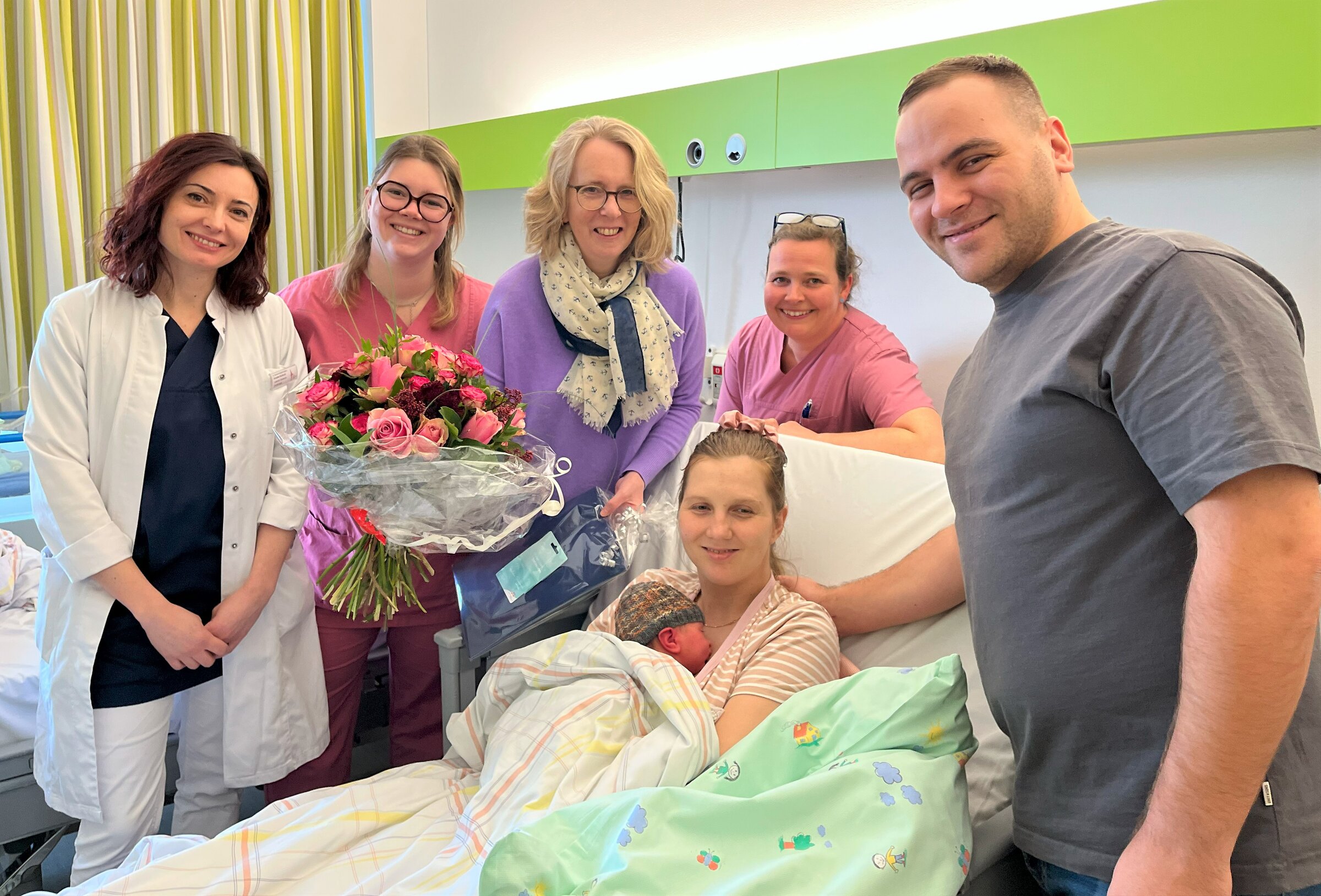 Als 1.000. Geburt, die auch immer ein besonderes Ereignis für das Gelderner Krankenhaus darstellt, erhielt die junge Familie dann auch noch ganz besondere Glückwünsche: Dr. med. Ute Janßen, Chefärztin der Klinik für Gynäkologie und Geburtshilfe, überreichte gemeinsam mit der Oberärztin Donalda Surducki sowie den beiden Hebammen Katharina Leenen und Pia Gutsfeld einen großen Rosenstrauß und gratulierte. „Wir wünschen Ihnen als junge Familie mit Ihrem Sohn alles Gute“, so die Chefärztin.