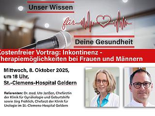 Am Mittwoch, 08. Oktober 2025, um 18 Uhr referieren die Chefärzte Dr. med. Ute Janßen und Jörg Fröhlich gemeinsam über die Behandlungsoptionen bei Blasenschwäche im St.-Clemens-Hospital.