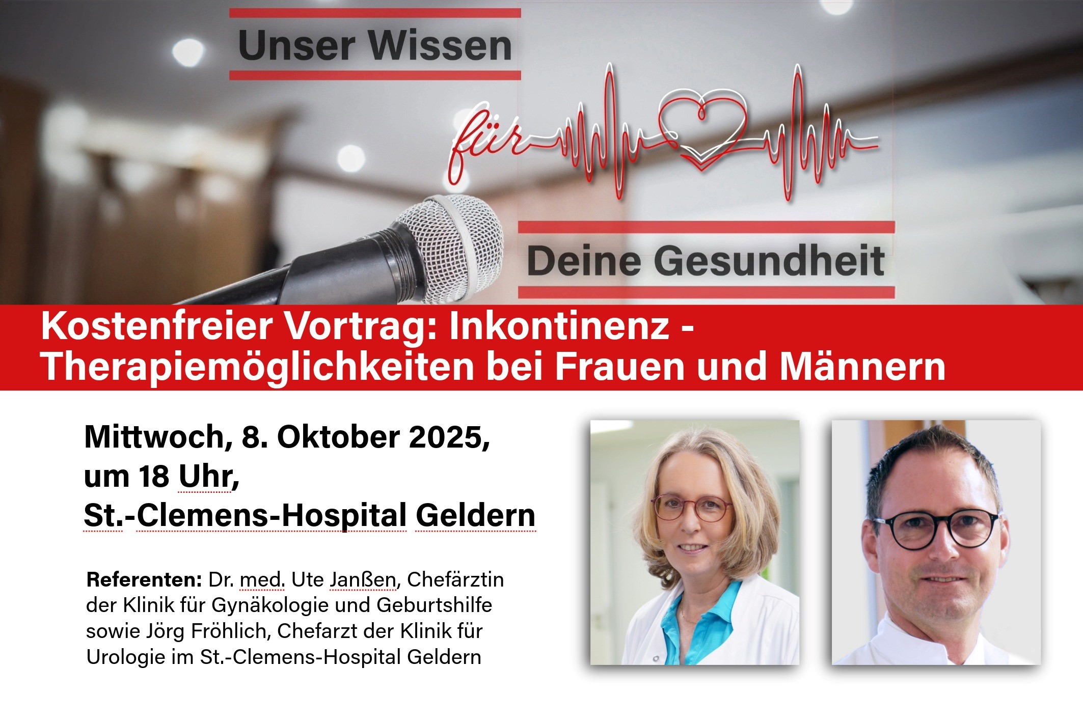 Über die Diagnostik und die Therapiemöglichkeiten bei Inkontinenz referieren Dr. med. Ute Janßen, Chefärztin der Klinik für Gynäkologie und Geburtshilfe, sowie Jörg Fröhlich, Chefarzt der Klinik für Urologie des St.-Clemens-Hospitals Geldern am Mittwoch, 08. Oktober 2025, um 18 Uhr. In dem kostenfreien Vortrag „Inkontinenz – Therapiemöglichkeiten bei Frauen und Männern“ im Veranstaltungsraum im 4. Obergeschoss des St.-Clemens-Hospitals stellen sie die aktuellen Behandlungsoptionen bei Blasenschwäche vor.